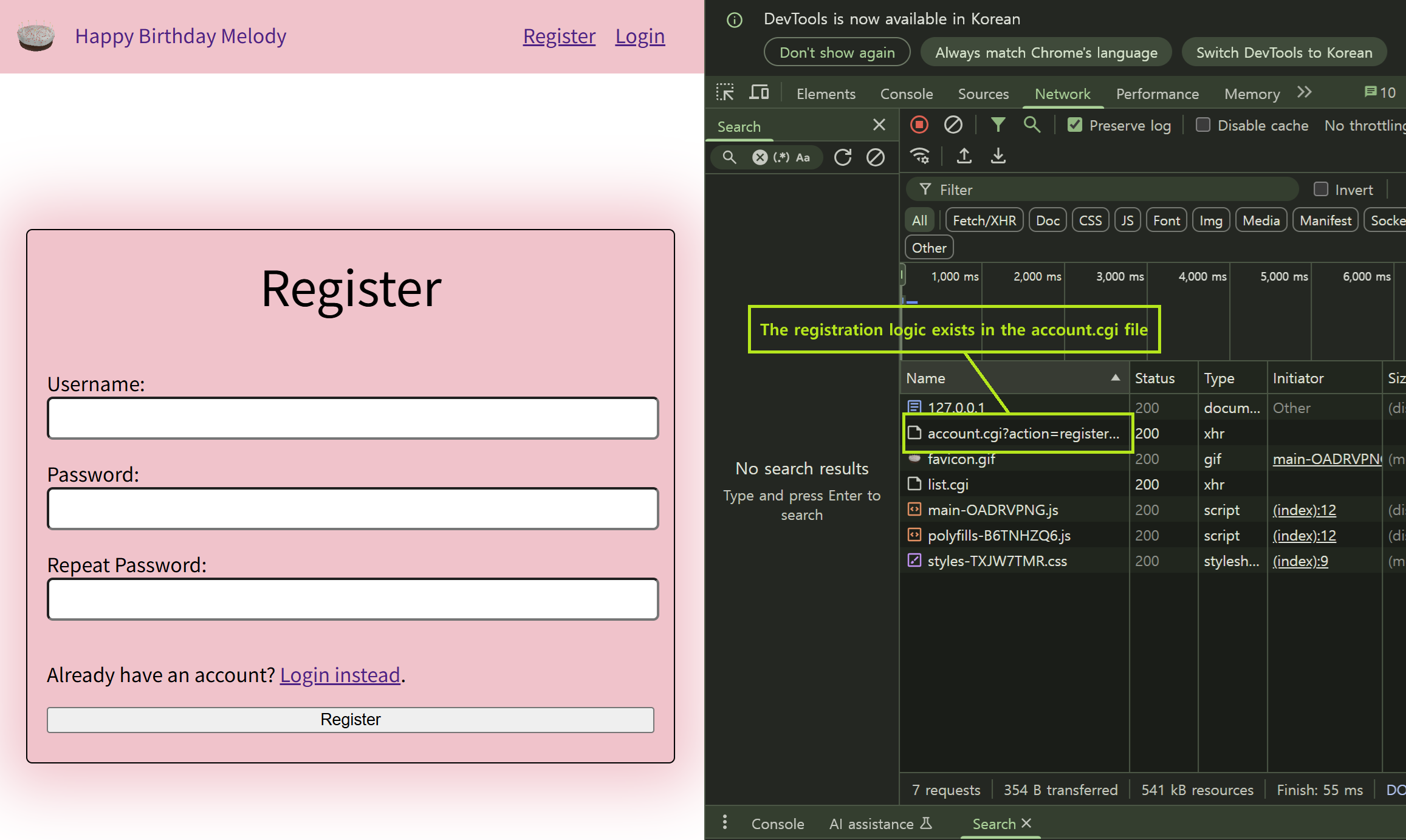 회원가입 쪽을 확인해보고, 회원가입 시도를 해보니, account.cgi 엔드포인트단 에 HTTP 요청을 보내는 것을 확인했습니다. 따라서, cgi/account.cgi 바이너리를 분석하면 회원가입과 관련된 취약점을 발견할 수 있지 않을까라는 기대감으로 account.cgi 를 분석하기로 결정했습니다.