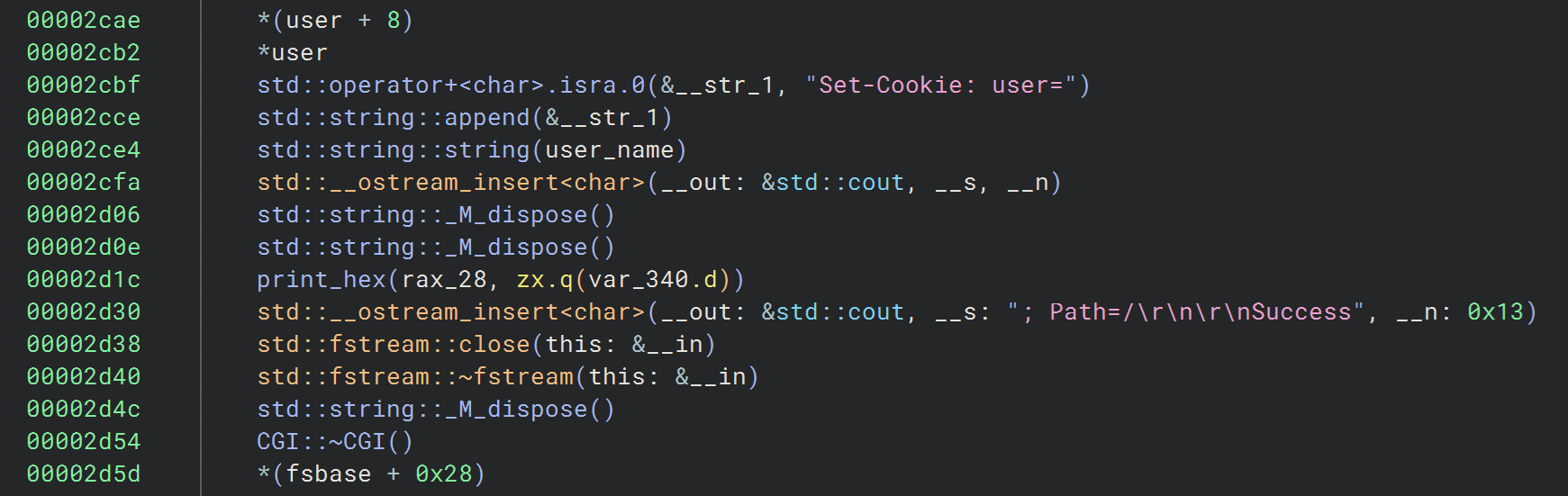 Set-Cookie 관련 로직은 account.cgi main 함수 끝 부분에서 확인 할 수 있는데, 회원가입한 username 이 그대로 응답 창에 들어가게 되고, “/” 말고 필터링 해주는 것이 없기 때문에 Header Injection 이 가능할 수 있다고 생각했습니다.